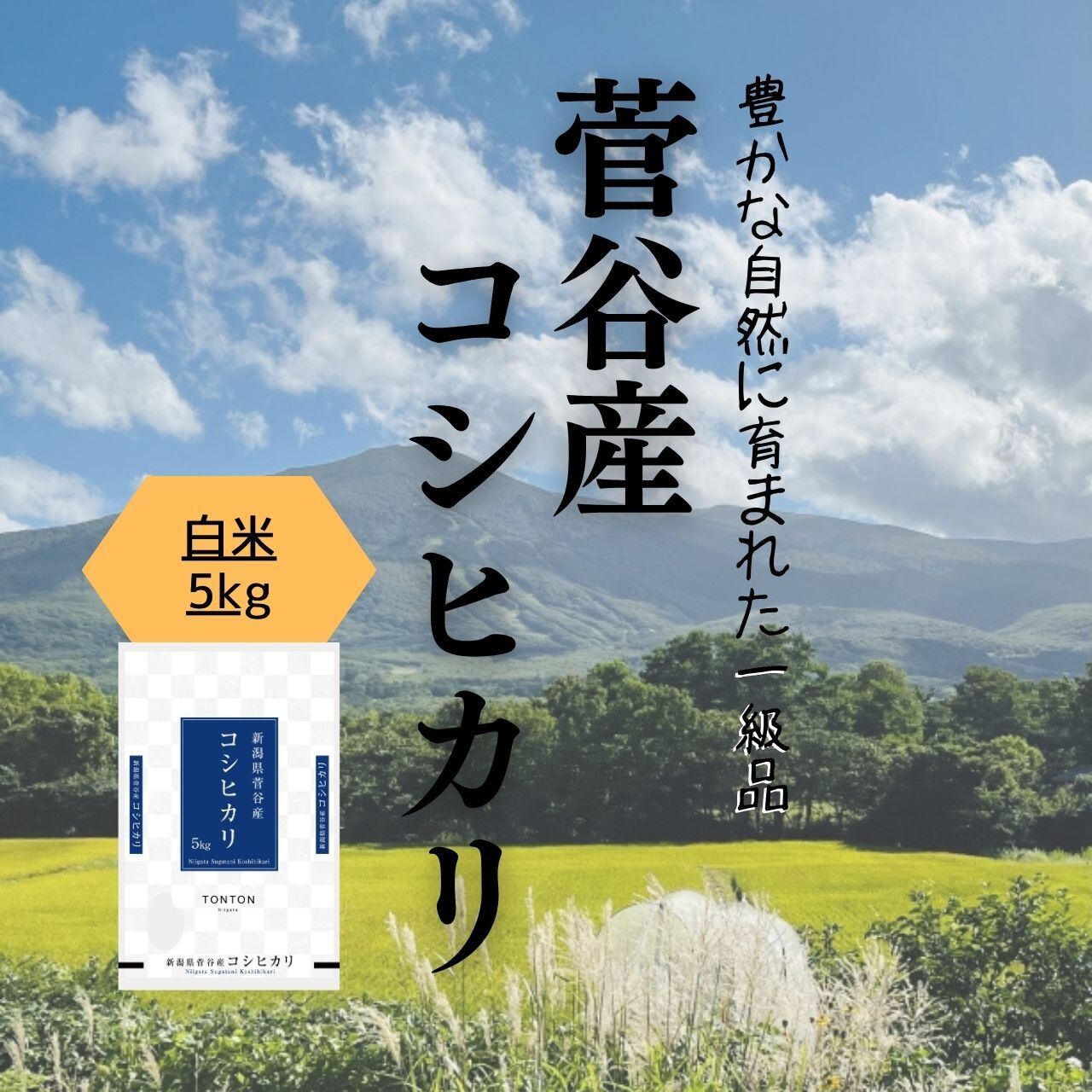 新潟県新発田市菅谷地区は、市街地から離れた自然豊かな地域。米作りに最適な環境で、のびのびと育ったコシヒカリは一粒一粒の味が濃く、旨味や甘みが詰まっています。
